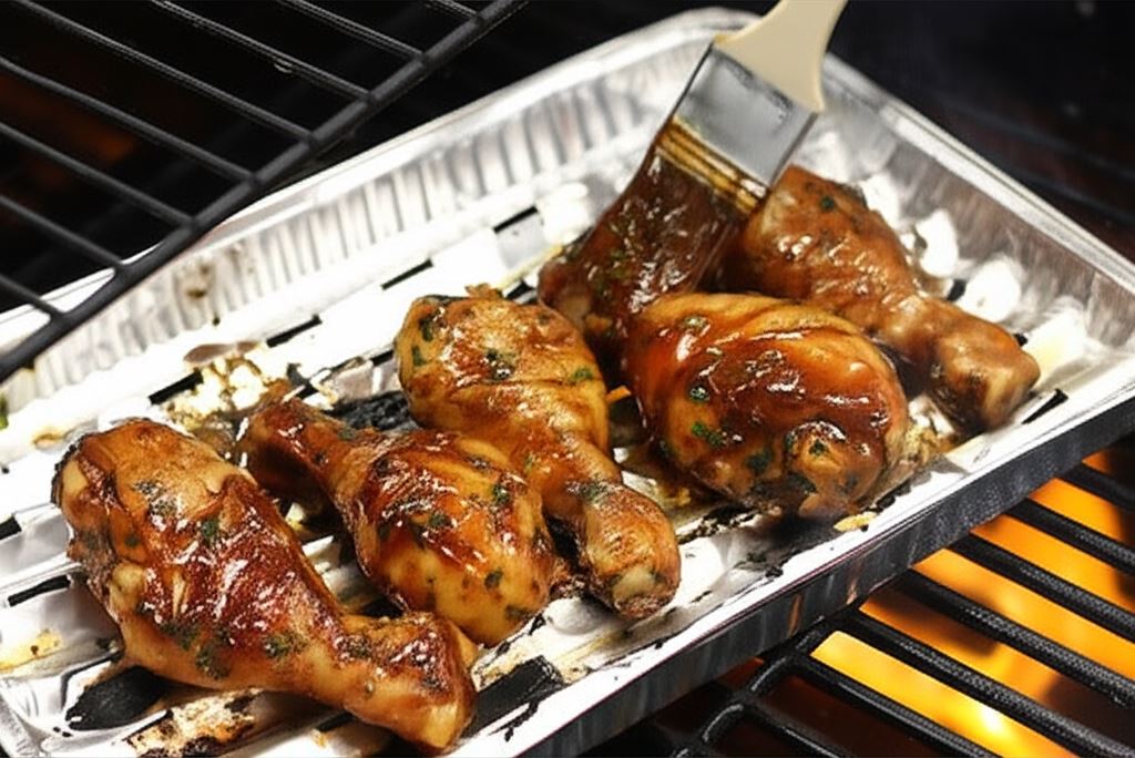 Piecz udka na średnio nagrzanym grillu, umieszczone na aluminiowych tackach, pod pokrywą przez około 40 minut. Grillując obracaj udka regularnie i co pewien czas smaruj je marynatą.