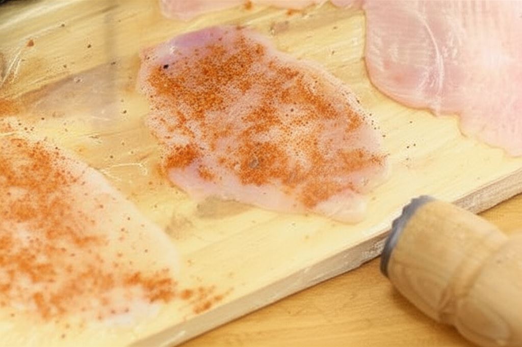 Filety z kurczaka przekrój wzdłużnie na cienkie plastry, umieść między dwoma arkuszami folii i lekko rozbij mięso, posyp obficie przyprawą do pikantnego kurczaka Knorr, która nada mięsu delikatną pikantność oraz soczystość. Mięso włóż do lodówki na około 30 minut.