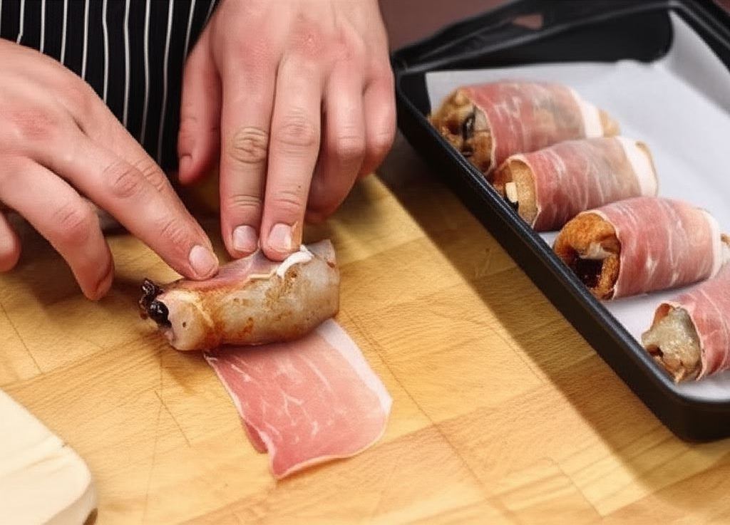 Całość owiń w plaster szynki, umieść na blasze do pieczenia wyłożonej pergaminem i włóż do rozgrzanego do 180°C piekarnika na około 25 minut.
