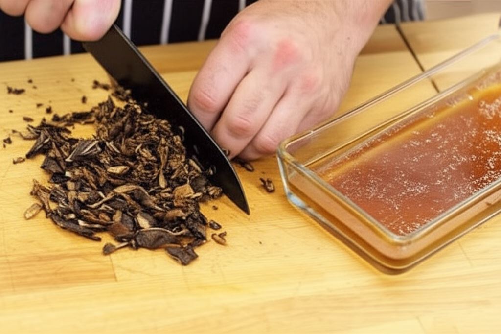 Suszone grzyby zalej 300 ml wrzątku. Odcedź je i potnij w cienkie paski, wywar odłóż.