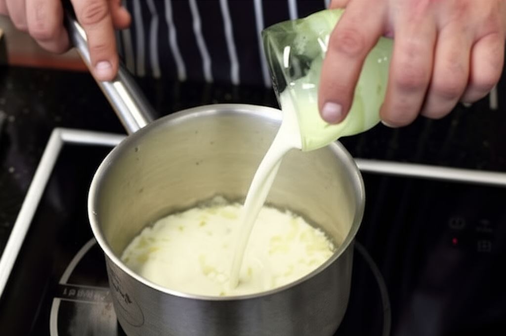 Cebule posiekaj w małą kostkę - jedną część zrumień na oliwie. Dodaj śmietanę i gotuj przez 3-4 minuty. Sos przypraw według gustu.