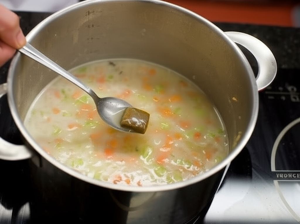 Po upływie tego czasu wsyp do zupy dwie kostki Rosołu szlachetnego drobiowo-warzywnego Knorr i ser. Mieszając nieustannie, doprowadź do tego, by ser w zupie uzyskał konsystencję emulsji.