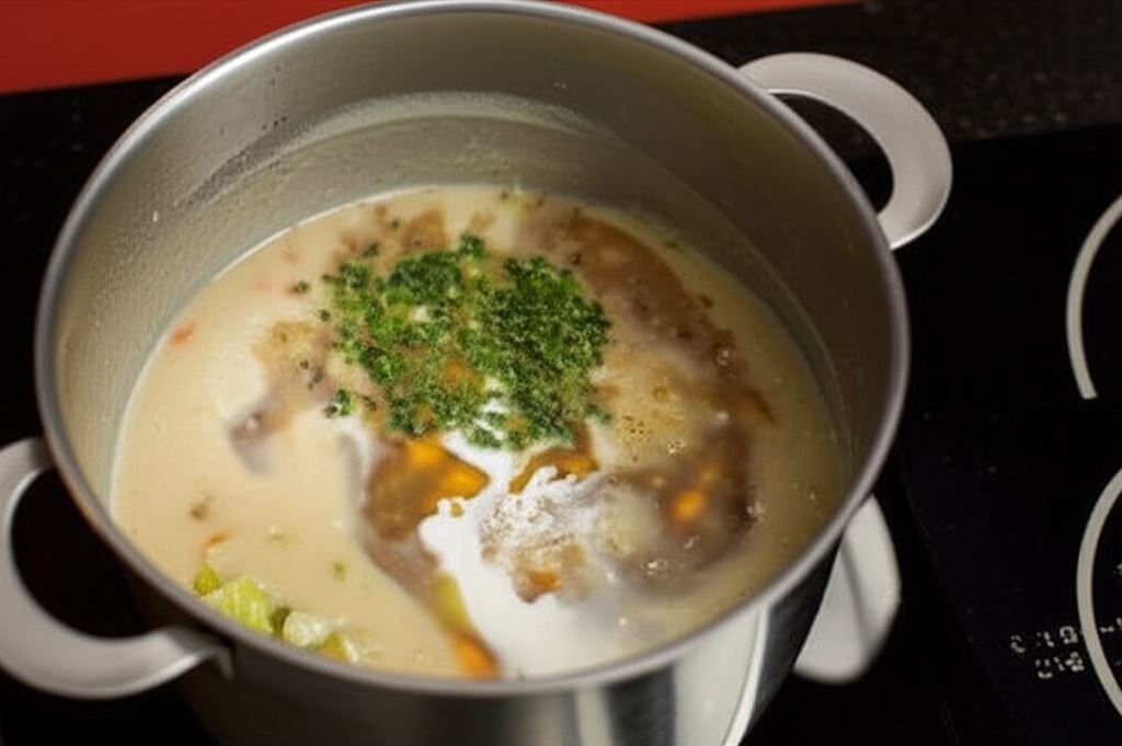 Wlej piwo, dodaj czosnek i tymianek. Śmietaną zapraw zupę i gotuj jeszcze około 5 minut.
