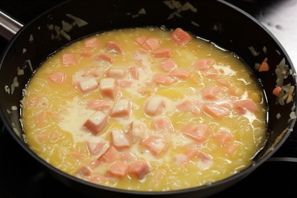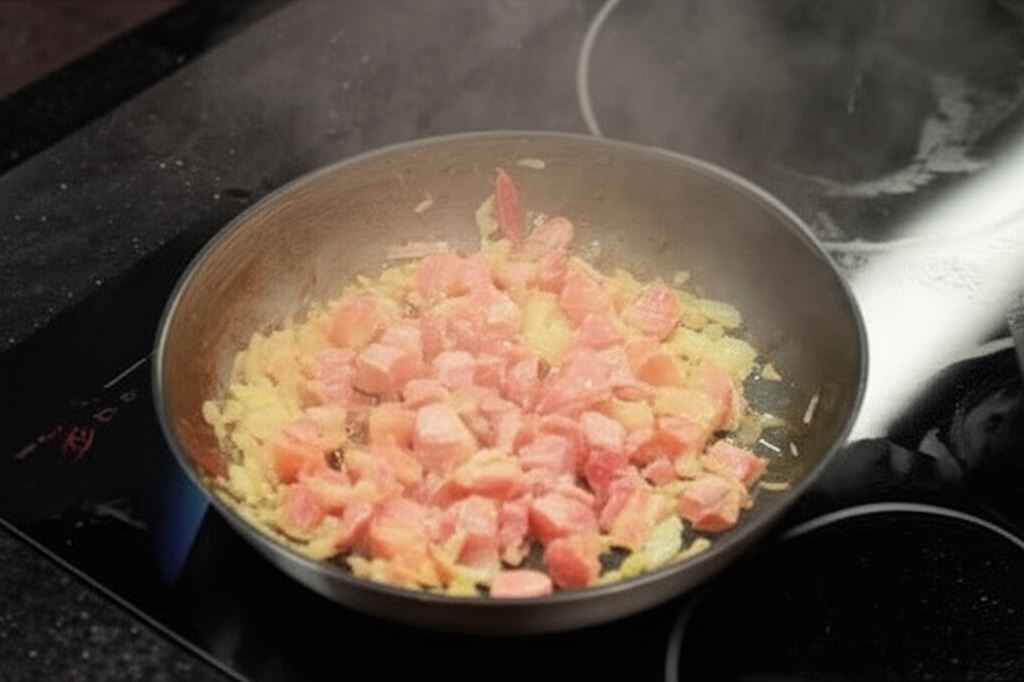 Posiekaj cebulę w kostkę i zrumień ją na oliwie. Potem pokrój łososia w kostkę, dorzuć do cebuli i zalej białym winem. Gotuj aż do momentu, kiedy wino całkiem wyparuje.