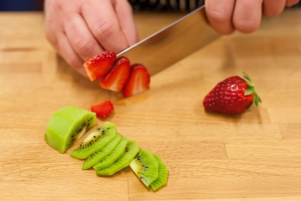 Kiwi potnij na półplasterki, a truskawkę pokrój wzdłużnie na plastry.
