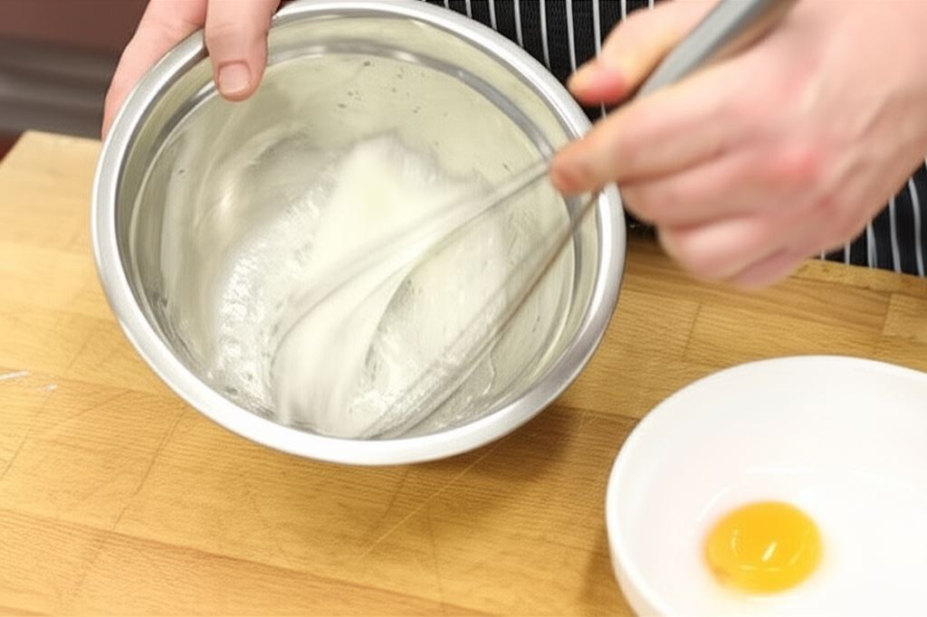 Oddziel żółtka od białek. Z białek wytrzep pianę. W garnku o szerokim dnie zagotuj 1 litr wody.