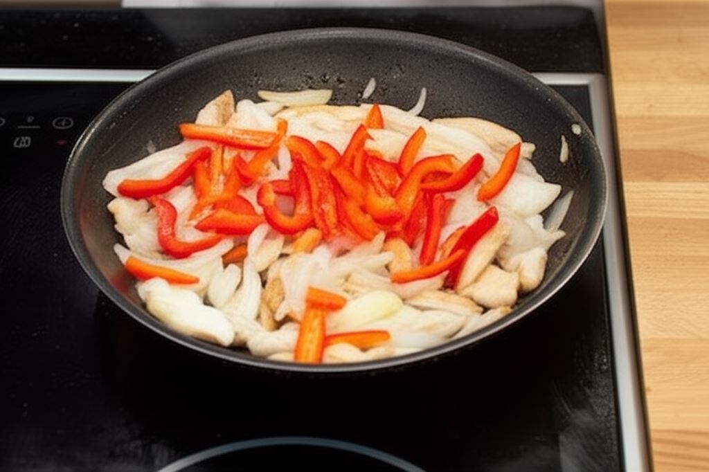 Na rozgrzanej patelni podsmażaj najpierw kurczaka, następnie po kolei cebulę i paprykę.