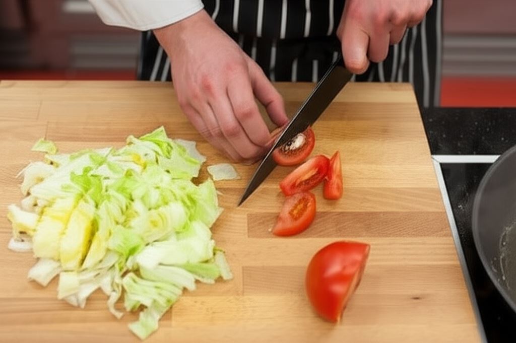Sałatę lodową potnij na duże kostki, a pomidora podziel na cząstki.