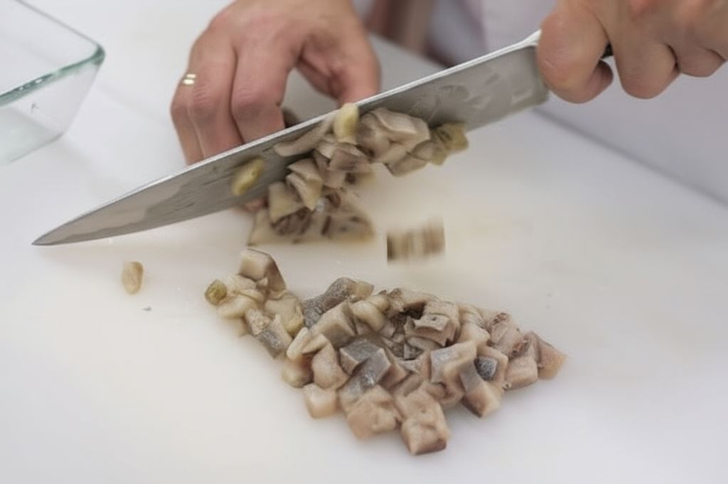Śledzie zamocz. Pokrój w kosteczkę.
