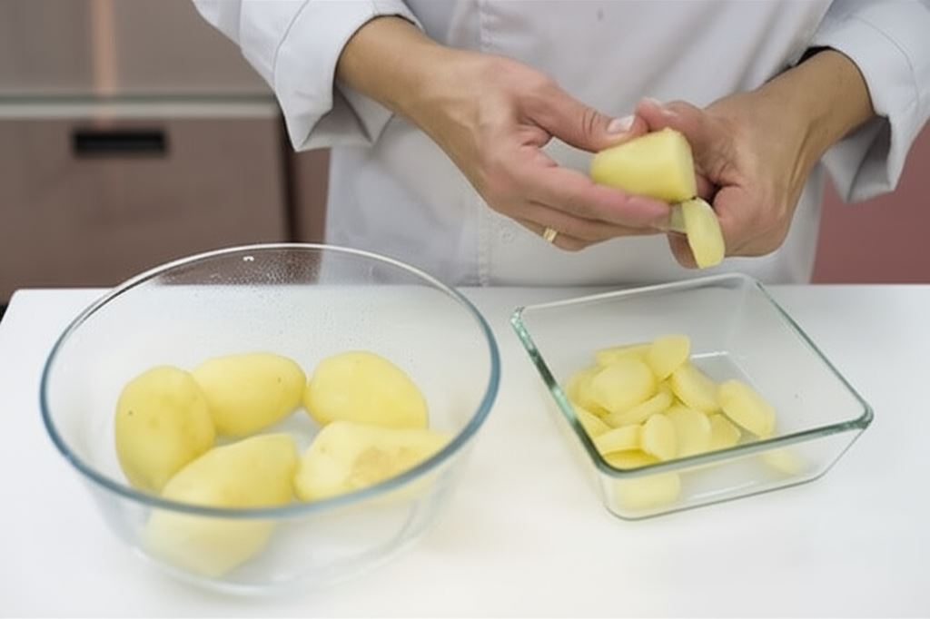 Ziemniaki ugotuj w mundurkach. Następnie obierz i potnij na plastry.