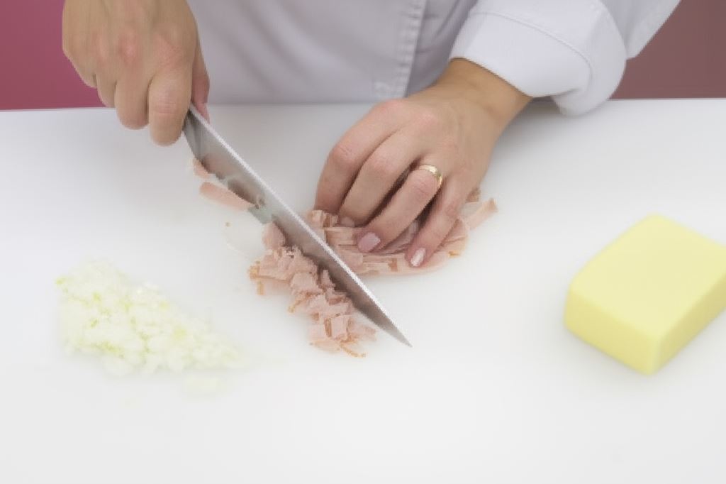 Cebulę posiekaj w kostkę, ser zetrzeć, szynkę pokrój w kawałki.