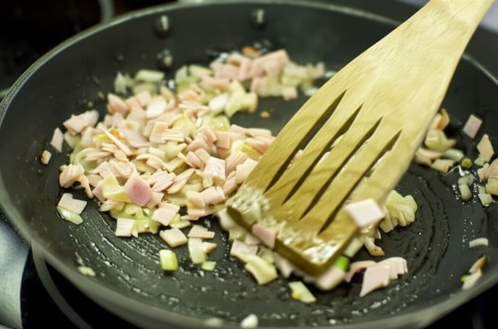 Posiekaną w kostkę cebulę zeszklij na oliwie. Dorzuć szynkę i delikatnie podsmaż.