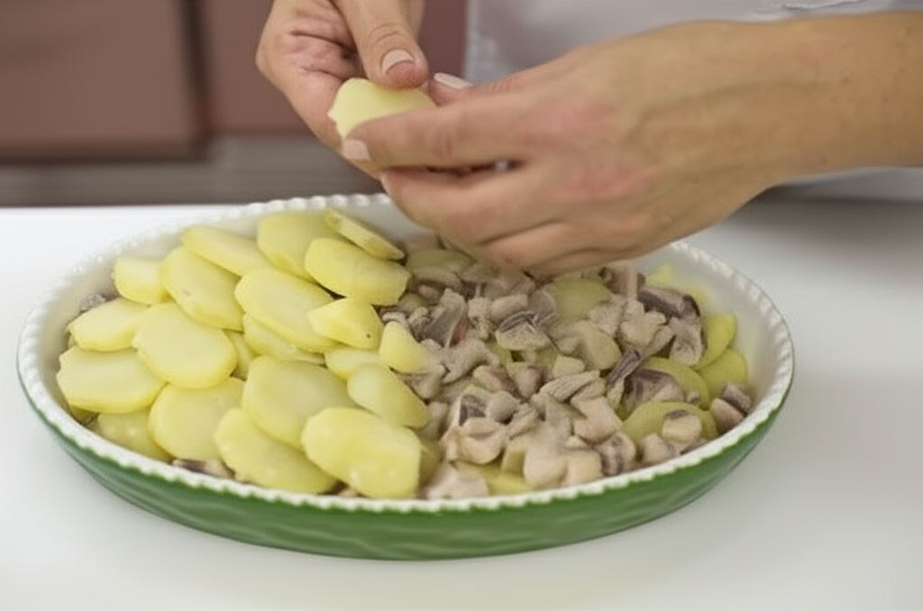 W natłuszczonej formie żaroodpornej ułóż warstwę kartofli, śledzi, ponownie kartofli.