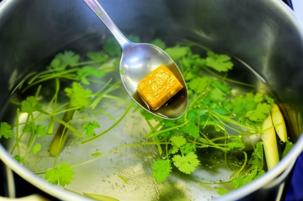 Wlej do garnka 1 litr wody. Posiekaj imbir i trawę cytrynową. Wrzuć kostkę Knorr, kawałki imbiru, trawy cytrynowej, łodygi kolendry (liście zachowaj). Przygotuj intensywny bulion. Odcedź go.
