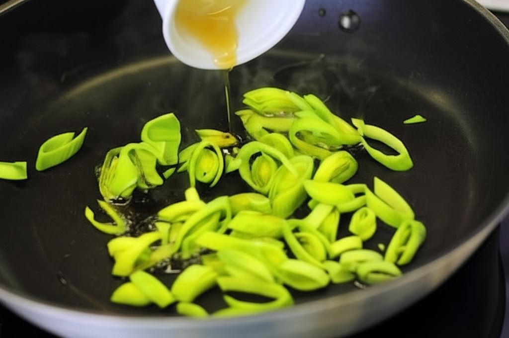 Wlej na patelnię olej sezamowy, wsyp pokrojonego w półplasterki pora.