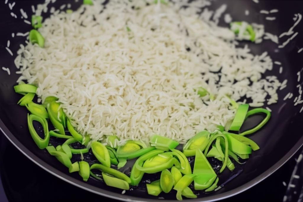 Po chwili podsmażania, wsyp wcześniej przepłukany ryż. Całość smaż przez parę minut.