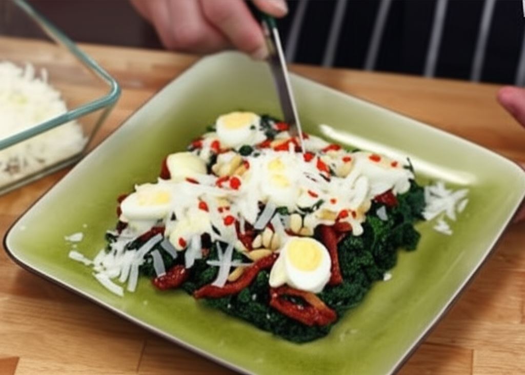 Przygotowany jarmuż rozłóż na półmisku, na nim umieść suszone pomidory pocięte w paseczki i ugotowane, przecięte na połówki jajka przepiórcze. Całość skrop od góry dresingiem sporządzonym z sosu sałatkowego Knorr, majonezu i kilku łyżek przegotowanej wody.