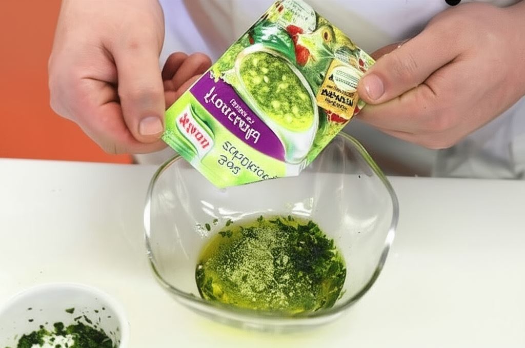 Pietruszkę oraz czosnek posiekaj na drobno. Sos Knorr wymieszaj z 4 łyżkami wody i oliwą. Dodaj do sosu pietruszkę oraz czosnek i połącz.