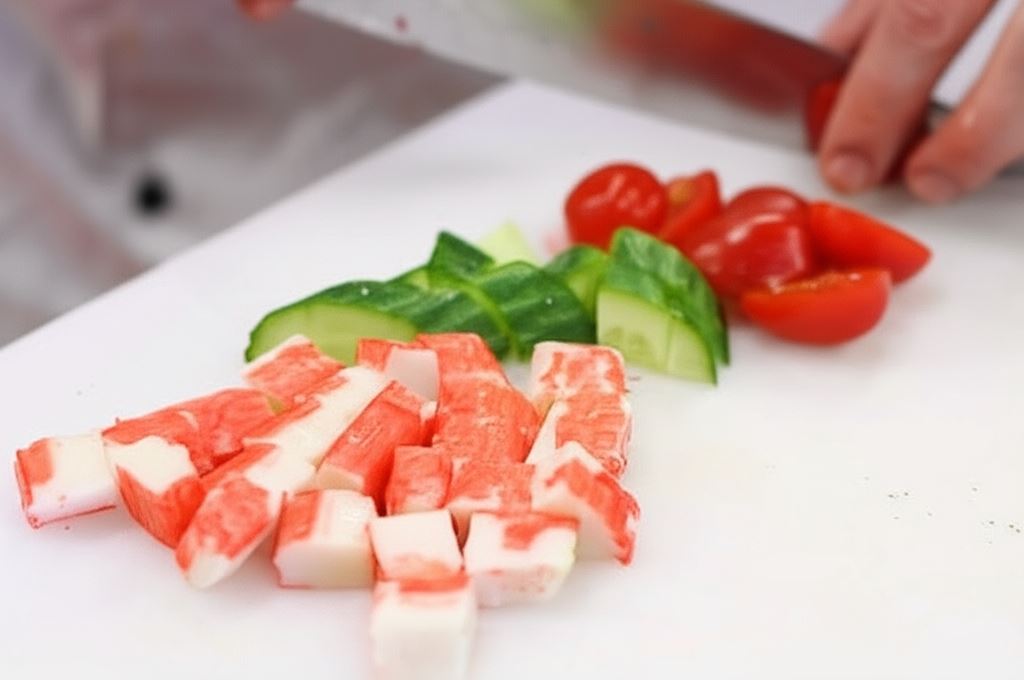 Delikatna sałatka z paluszkami krabowymi to doskonała propozycja na szybki, lekki posiłek. Soczyste pomidorki koktajlowe, chrupiący ogórek i delikatne paluszki surimi tworzą harmonijne połączenie smaków, które zostaje podkreślone aromatycznym sosem winegret z natką pietruszki i czosnkiem.