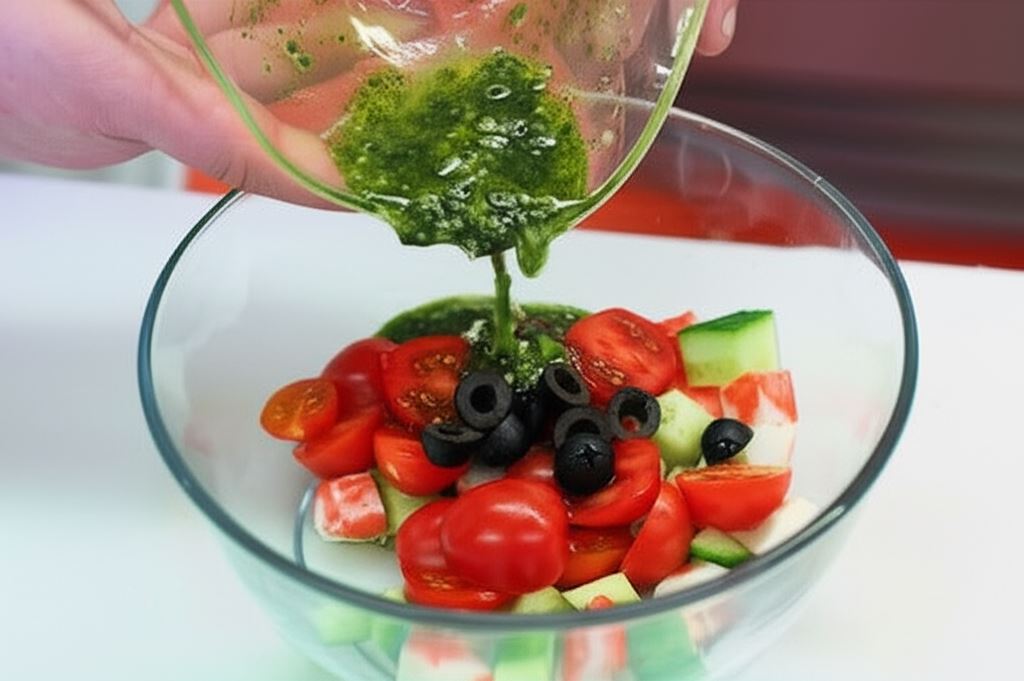 Do miski wrzuć mięso krabowe, ogórki, pomidorki i oliwki – wszystko polej przygotowanym sosem i zamieszaj. Przełóż gotową sałatkę na salaterkę i przystrój listkami pietruszki.