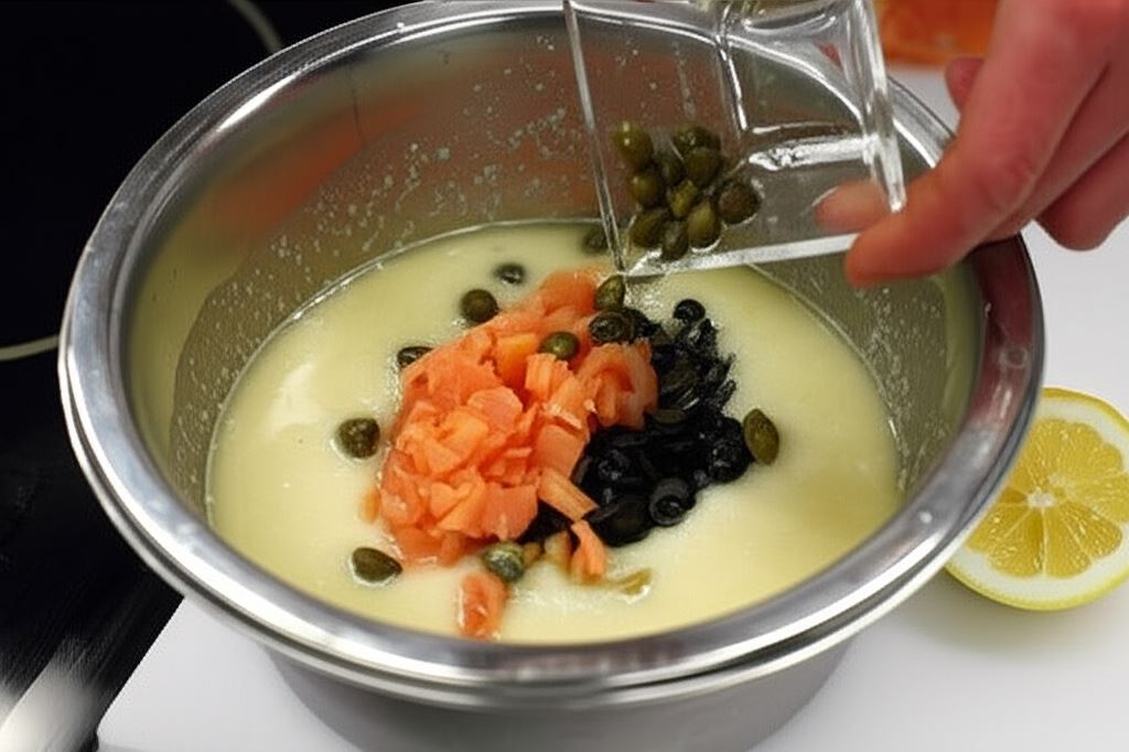Przygotuj Fix Chrupiące placki ziemniaczane zgodnie z instrukcją na opakowaniu, łącząc go z jajkiem i wodą. Odstaw na 10 minut, aby zgęstniał. Potem łososia, oliwki i kapary posiekaj drobno i połącz z masą na placki.