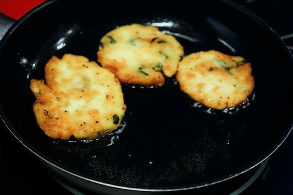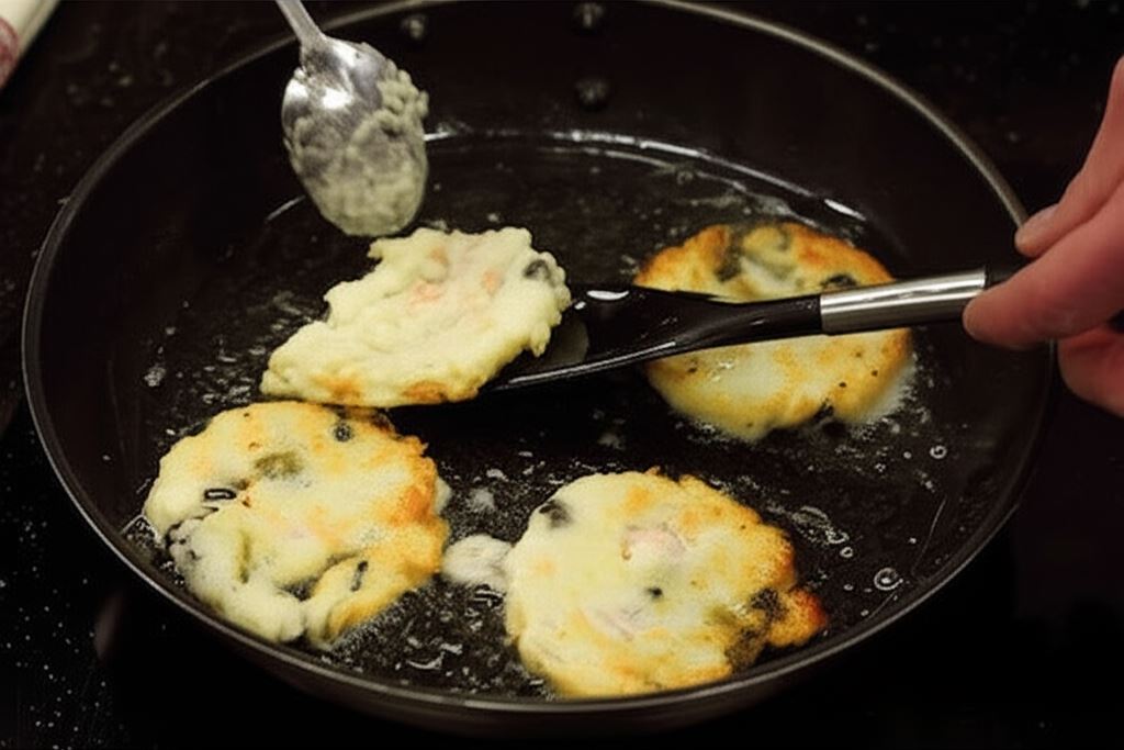 Nakładaj ciasto na rozgrzany tłuszcz, formując niewielkie placki. Smaż je do złotego koloru.