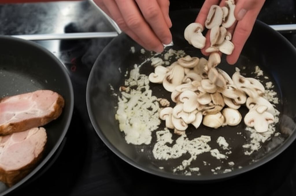 Na patelni lub w garnku, w którym było przygotowywane mięso, zrumień na gorącym tłuszczu drobno posiekaną w kostkę cebulę oraz grzyby pokrojone w plastry.
