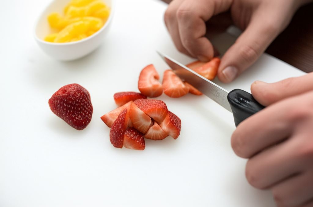 Ostrym nożem wytnij filety z obranego pomarańcza. Truskawki podziel na ćwiartki.