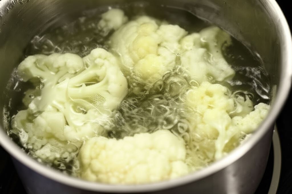 Kalafior podziel na różyczki i krótko ugotuj w osolonej wrzącej wodzie, odcedź.