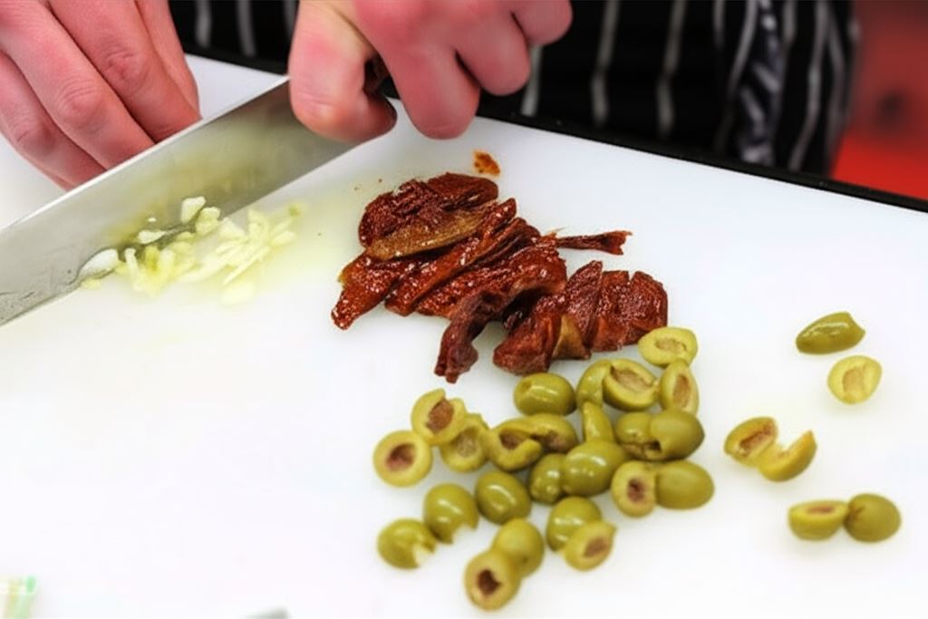 Oliwki przetnij na połówki, pomidory potnij w paski, czosnek drobno posiekaj.
