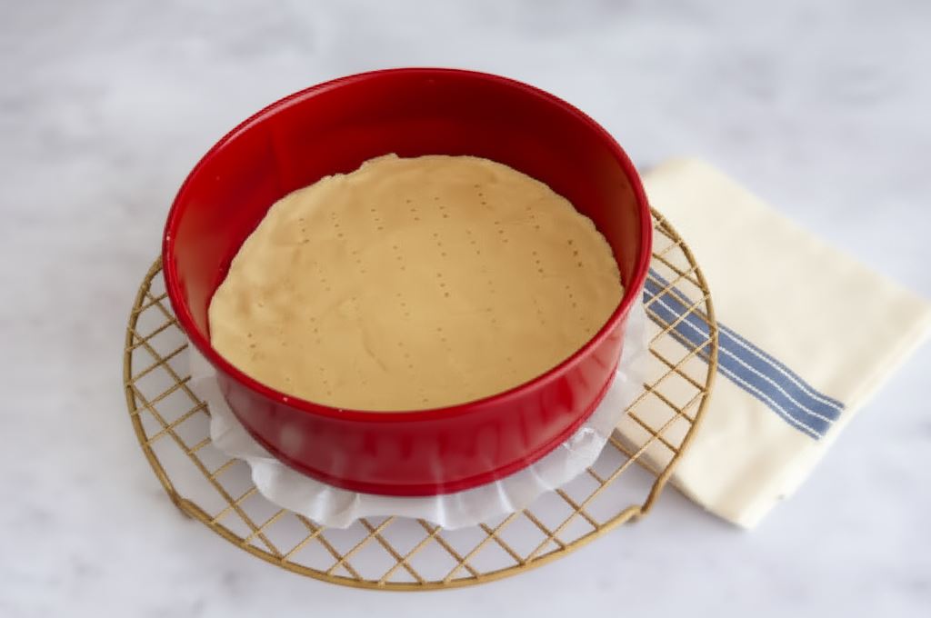 Umieść potem ciasto na dnie formy, wyścielonej papierem do pieczenia. Podpiecz spód w temperaturze 180 stopni przez 20 minut. Odstaw i rozpocznij przygotowanie masy serowej.