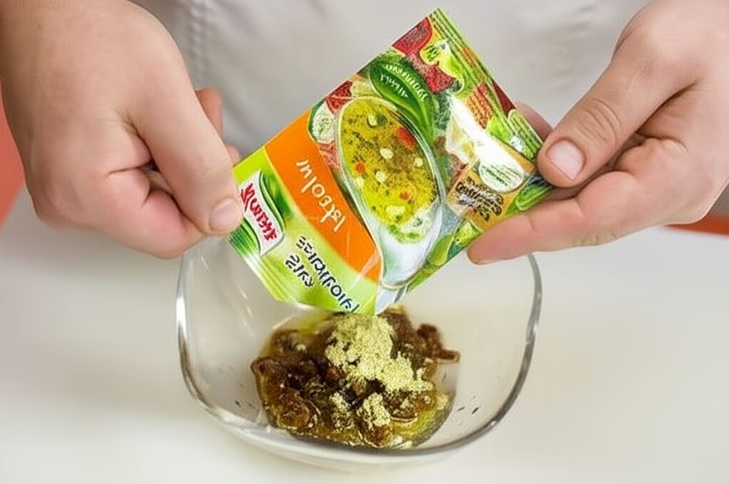 Sos Knorr połącz z 3 łyżkami wody i 3 łyżkami oliwy z pomidorów. Suszone pomidory posiekaj na drobno i wprowadź do sosu.