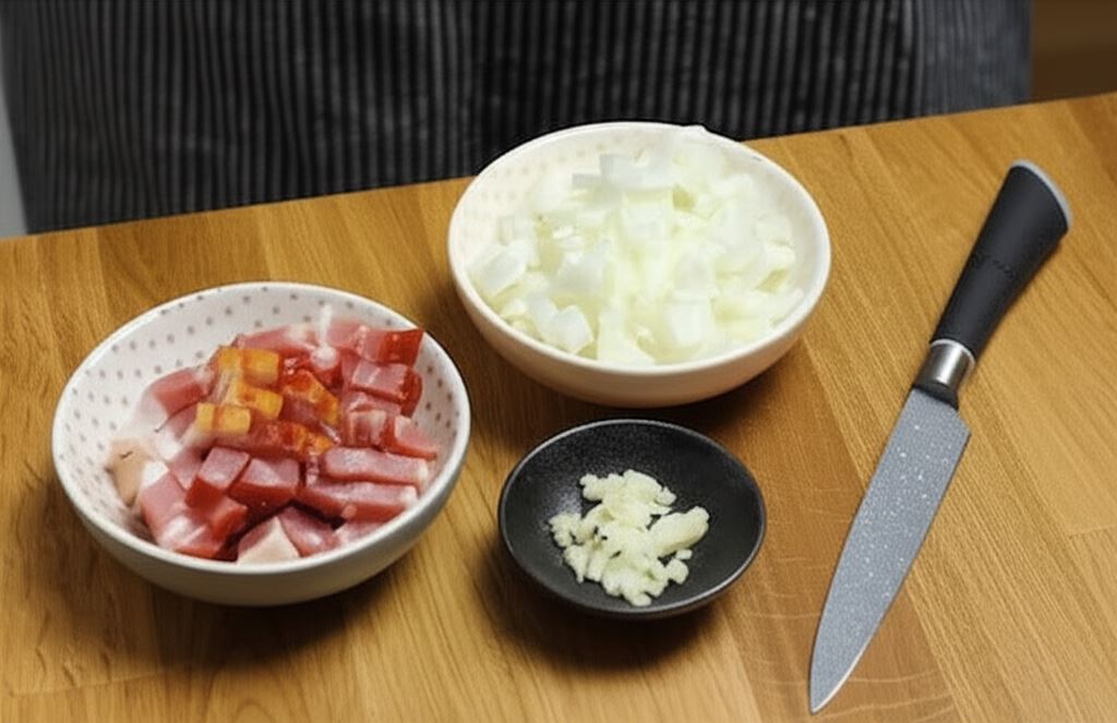 Boczek, cebulę i czosnek pokrój w drobną kostkę. Zrumień na suchej patelni.