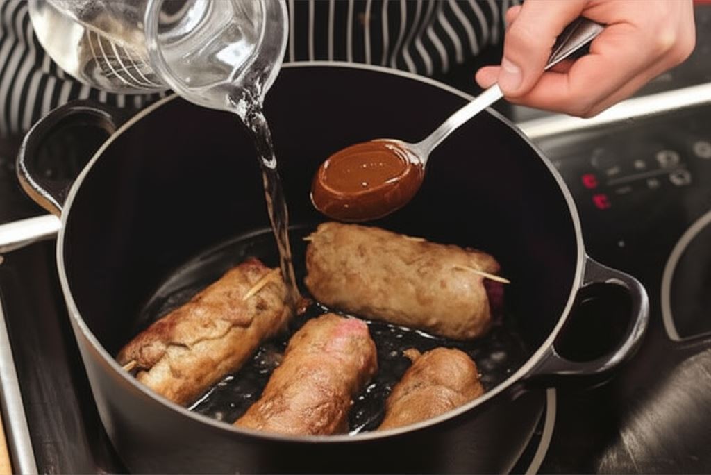 Gotowe roladki posyp mąką i podsmaż na gorącej patelni z niewielką ilością oliwy. Potem przenieś do garnka, zalej 500 ml wody i aby zrazy zyskały pełny smak wsyp Sos do pieczeni jasny Knorr. Zrazy duś na małym ogniu pod pokrywką przez 35-45 minut. Przed serwowaniem pamiętaj o wyjęciu wykałaczek.