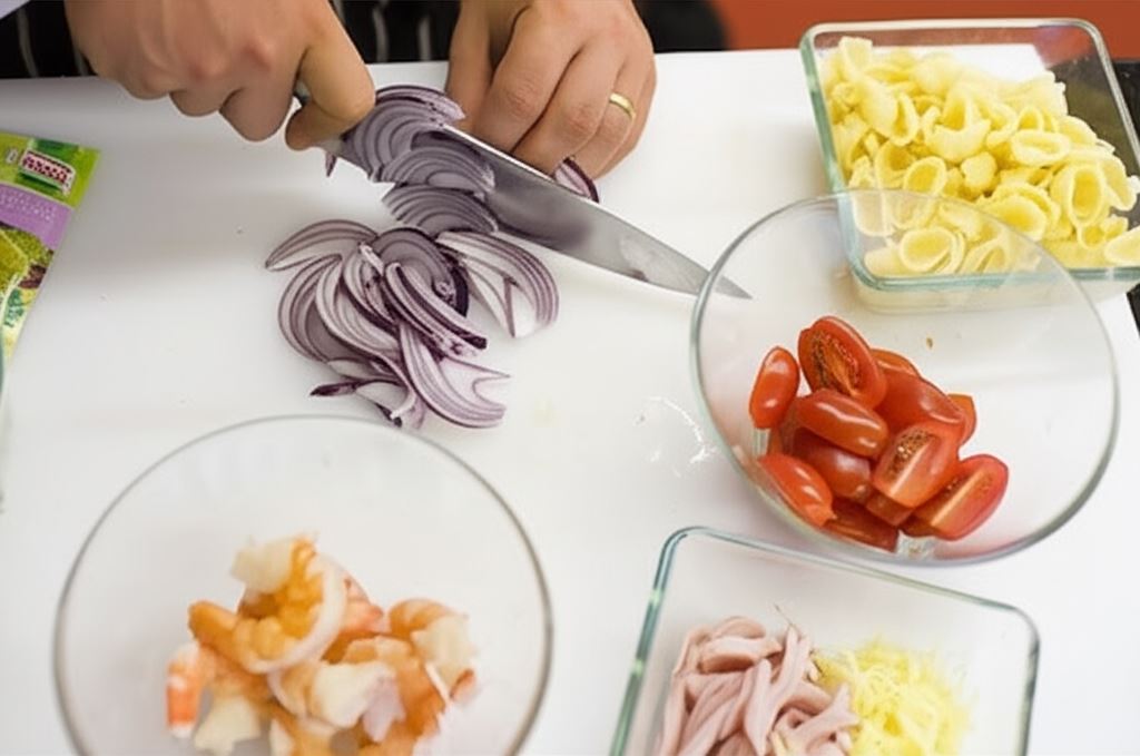 Szybka sałatka z krewetkami to doskonałe połączenie smaków morza z klasycznymi składnikami. Soczyste krewetki koktajlowe, których różowy kolor świadczy o tym, że są już ugotowane, wystarczy opłukać i osuszyć przed dodaniem do sałatki. Makaron ugotowany al dente, najlepiej w formie muszelek lub kolanek, stanowi idealną bazę dla pozostałych składników. Całość dopełniają cienkie paski szynki, żółtego sera, piórka cebuli oraz słodkie pomidorki koktajlowe przekrojone na pół.