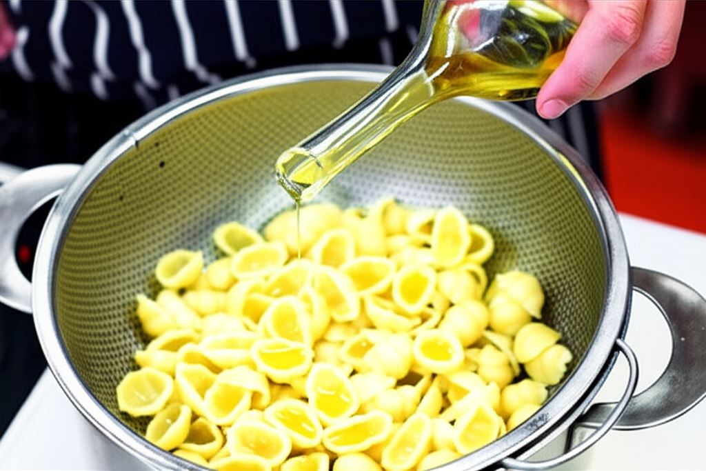 Makaron ugotuj w osolonej wodzie wrzącej, odcedź i ostudź. Skrop oliwą.