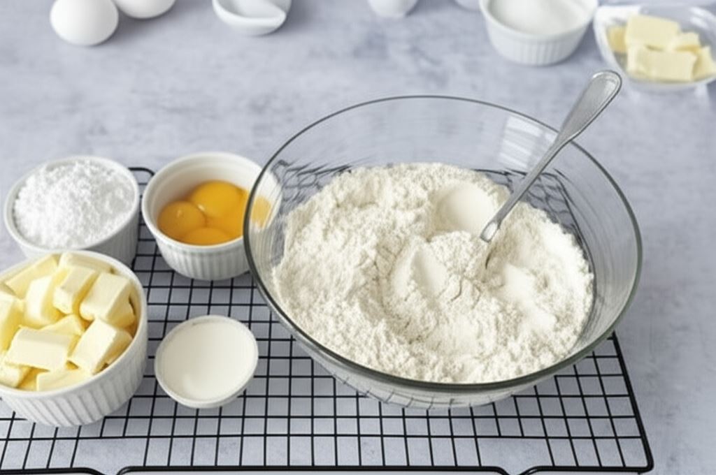 Do przesianej mąki z pszenicy dodaj cukier puder i proszek do pieczenia. Wymieszaj składniki. Dołóż żółtka, śmietanę i masło. Zagnieć wszystko razem. Podziel ciasto na trzy części. Do jednej części wsyp kakao. Zagnieć jeszcze raz. Umieść 2 części ciasta – jasną i kakaową w zamrażarce na około 45 minut.