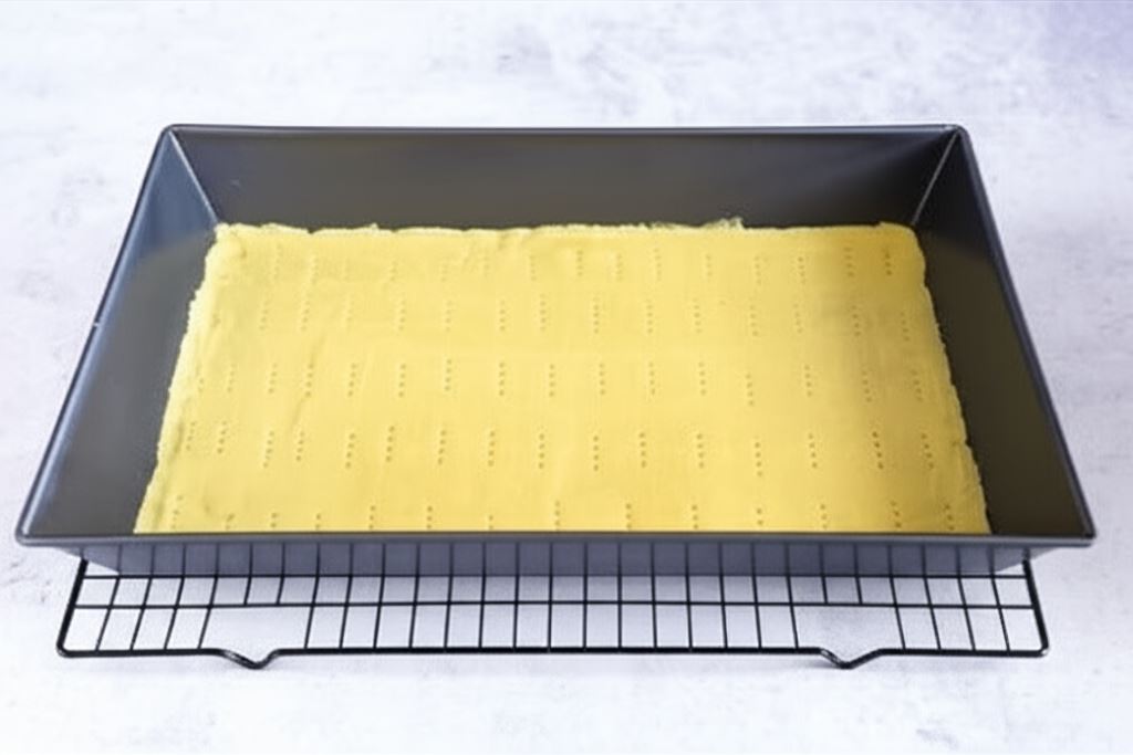 Przenieś resztę jasnej części ciasta na spód blaszki. Wyrównaj i nakłuj widelcem. Umieść w piekarniku, rozgrzanym do 180 stopni, na około 15 minut.