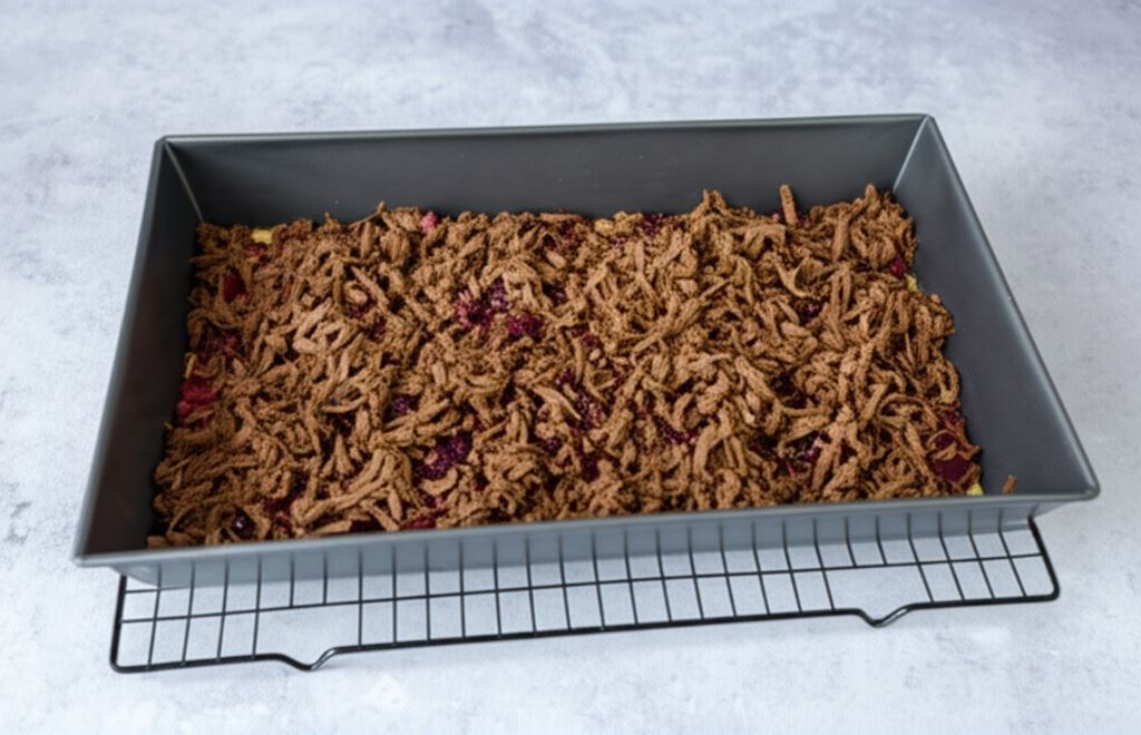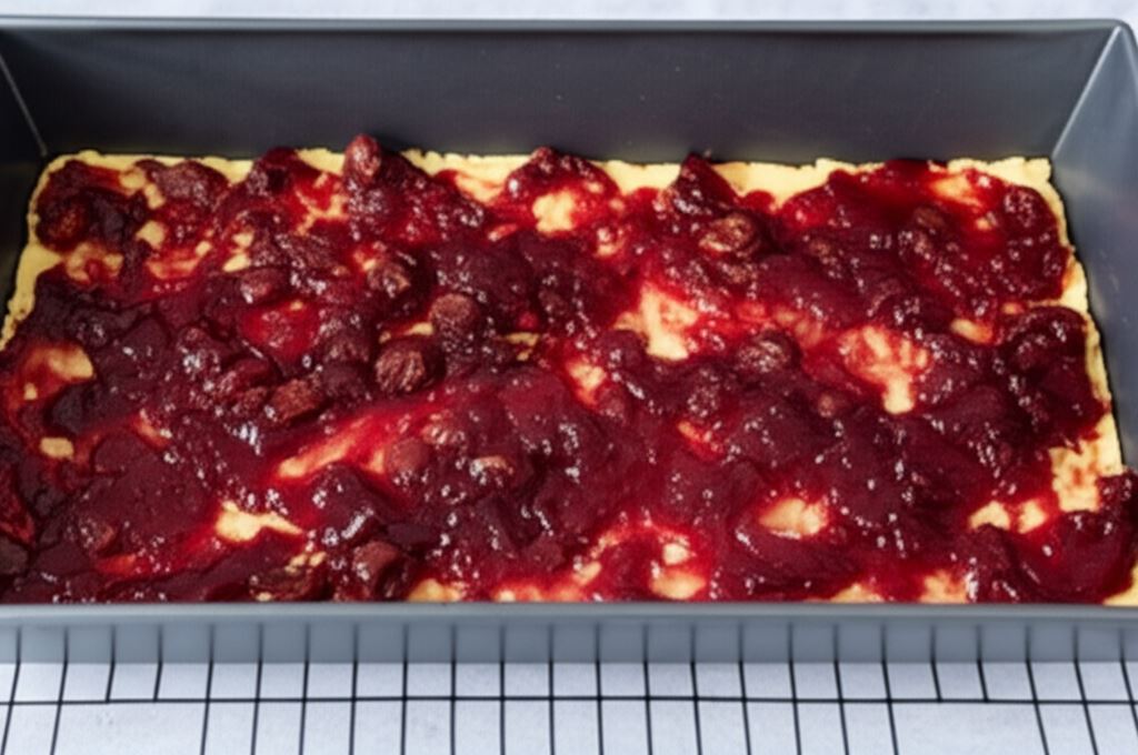Wyjmij z zamrażarki porcję ciasta kakaowego. Zetrzyj je na dżem z wiśni.