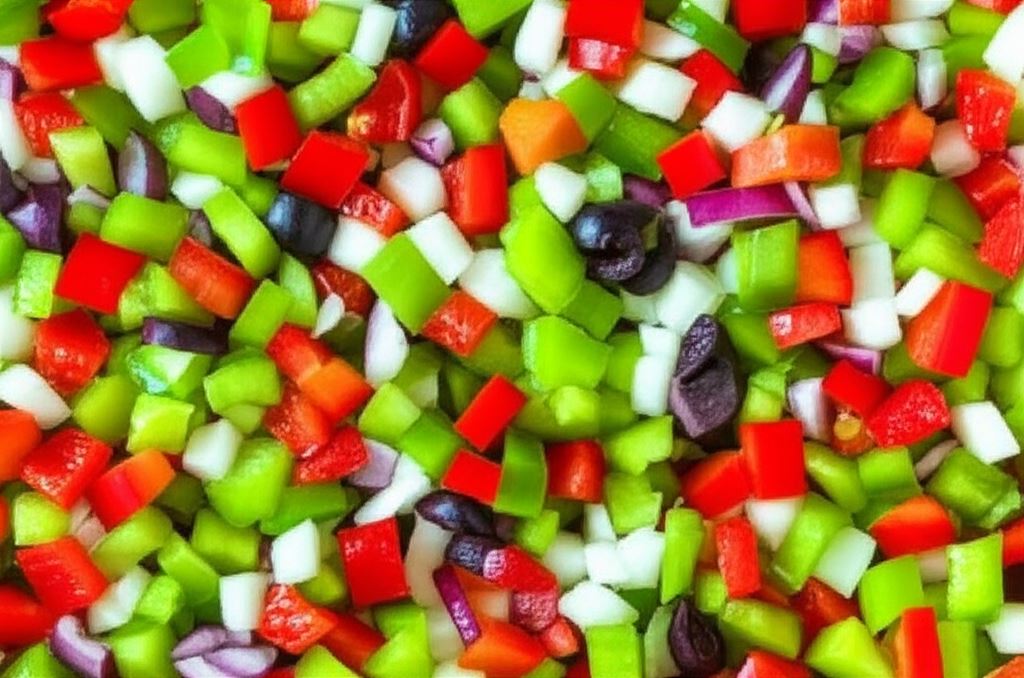Posiekaj cebulę, paprykę, chili i czosnek na drobną kostkę, a oliwki na plasterki.