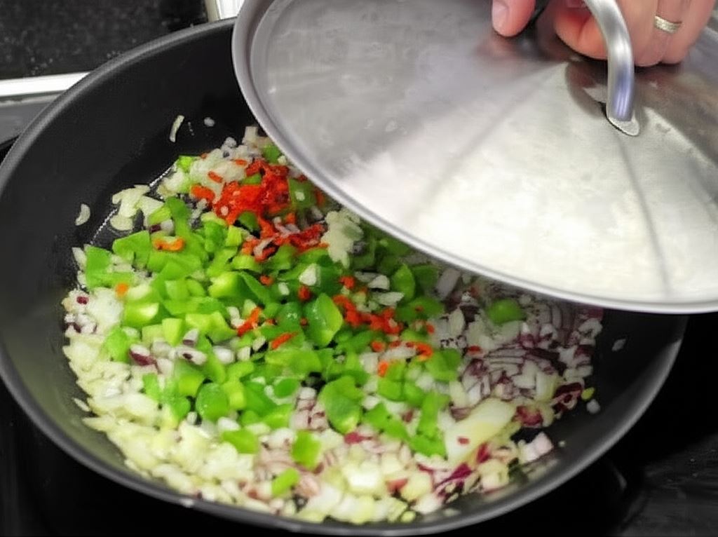 Zrumień cebulę na gorącej oliwie. Wsyp paprykę, chili i czosnek, następnie duś pod pokrywką przez około 5 minut.