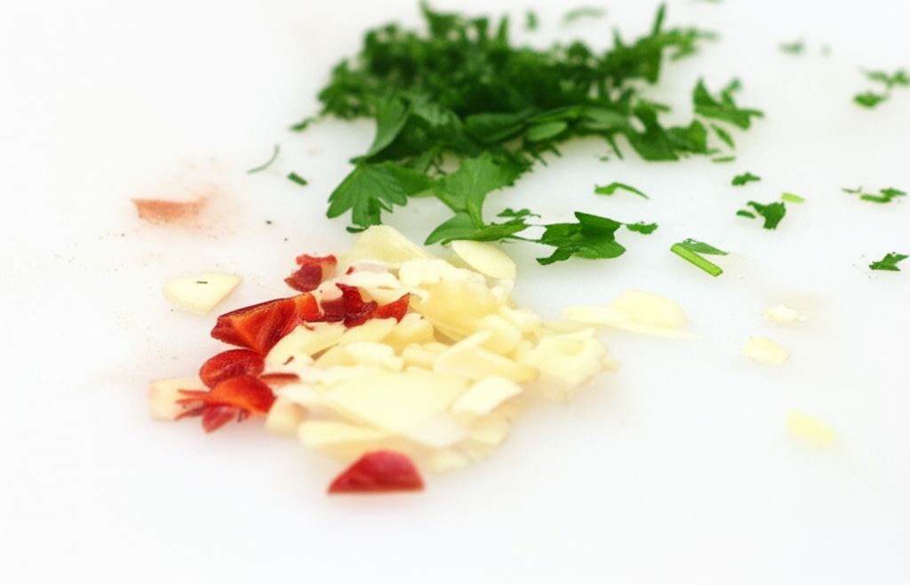 Drobno posiekaj czosnek, natkę pietruszki i ostrą paprykę.
