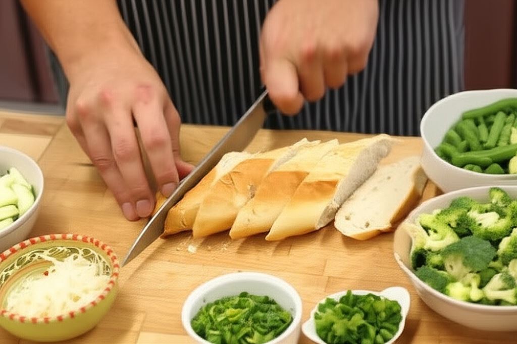 Cukinię pokrój w kosteczkę 0,5 cm, fasolkę podziel na 2 cm kawałki, z brokułu wytnij małe różyczki, posiekaj natkę pietruszki i czosnek, pokrój szczypiorek, parmezan zetrzyj na tarce. Bagietkę pokrój na 2 cm grubości kromki.