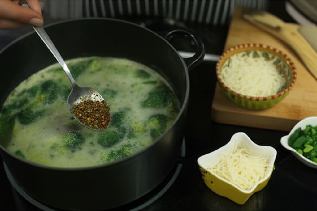Do zupy wsyp parmezan, ser gruyer, jedną łyżkę grubo mielonej przyprawy Knorr, natkę pietruszki i szczypior, wszystko starannie wymieszaj i gotuj przez kolejne 10 minut.