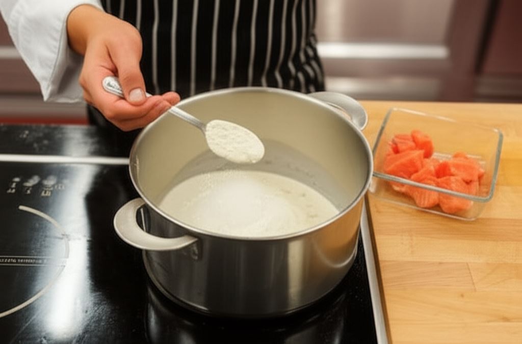 Łososia potnij w kostkę 3x3 cm. W małym garnku zeszklij posiekaną w drobną kostkę cebulę, wsyp śmietanę oraz Przyprawę Knorr. Wszystko zagotuj.