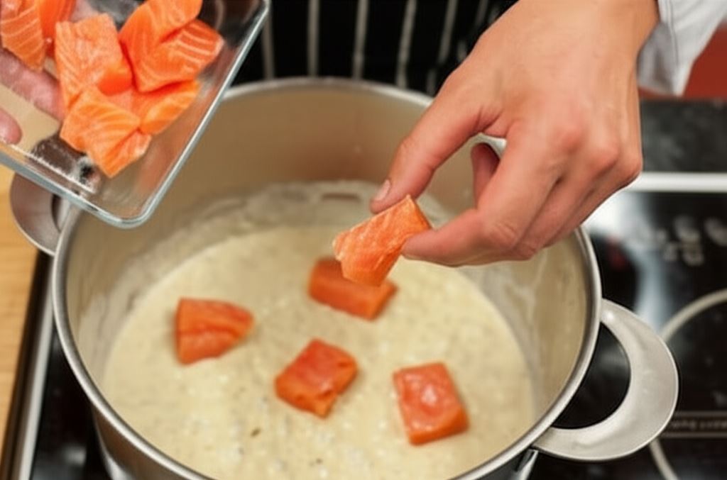 Umieść kawałki łososia w sosie, zredukuj ogień i nakryj garnek. Gotuj rybę przez 3 minuty.