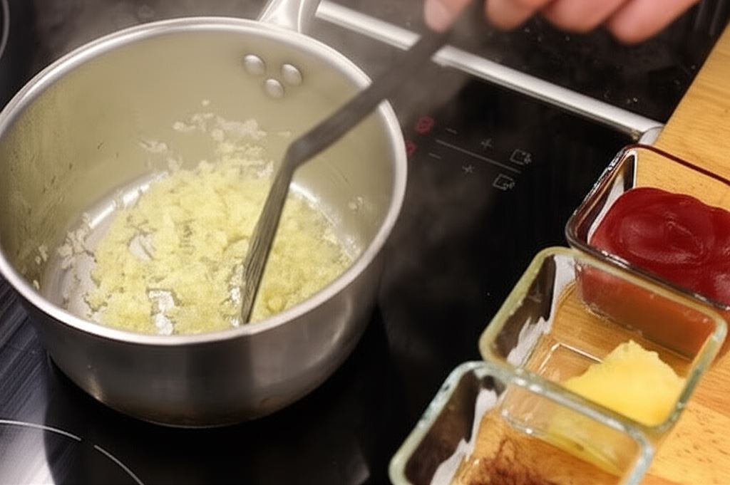 Szalotkę posiekaj w małą kostkę, przesmaż na gorącej oliwie, potem dodaj miód, chili i ketchup.