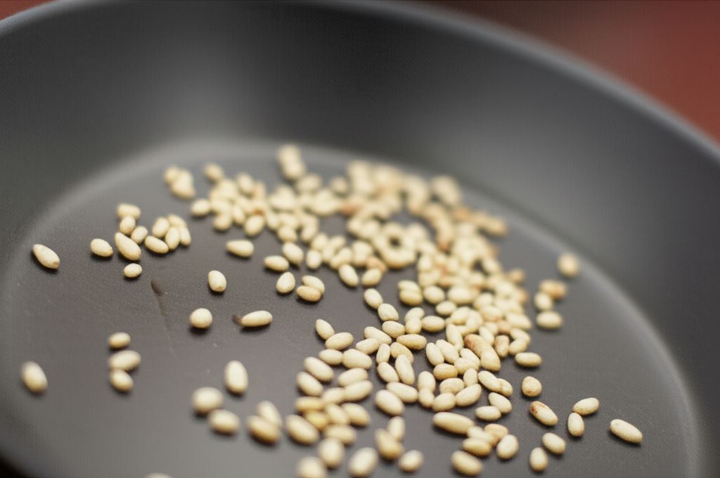 Prażyj orzeszki pinii na patelni. Marchew zetrzyj na drobnej tarce.
