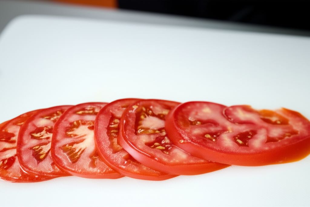Opłucz pomidory i wytnij szypułki, następnie pokrój je na plastry.