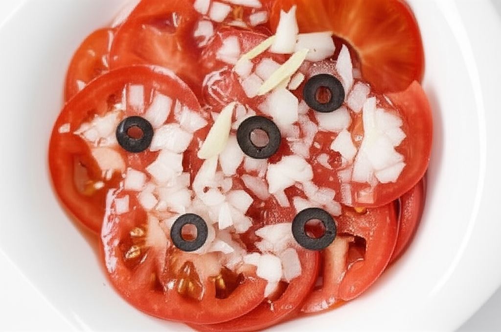 Obierz cebulę, drobno posiekaj i wraz z pomidorami umieść na talerzu. Całość udekoruj oliwkami.